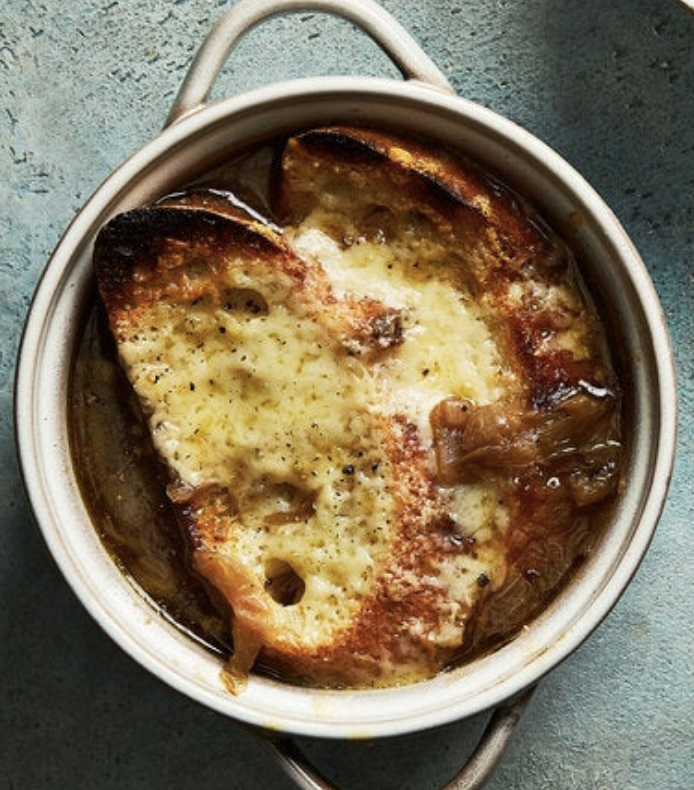 The ultimate comfort food is made with caramelized onions, rich beef broth, and toasted bread topped with Gruyère cheese.
