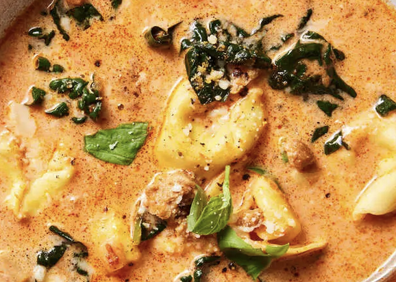 Store-bought, cheese-filled tortellini are immersed in an extra creamy tomato broth alongside Italian sausage and Tuscan (lacinato) kale, creating a hearty soup.